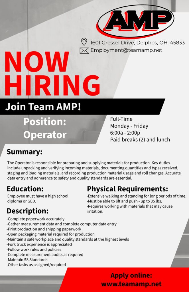 AMP, is an advanced manufacturing facility, dedicated to providing our customers quality products designed by them. AMP takes pride in our production team, as they use their detailed orientated skills and are motivated to exceed our customers’ expectations. In our facility, our hard-working attitude is directed by the “Power to Change Industry”. Start your career with us and be part of Advanced Manufacturing Production.